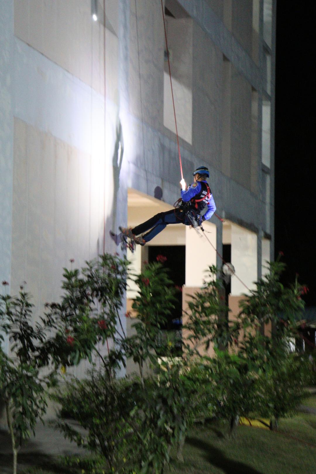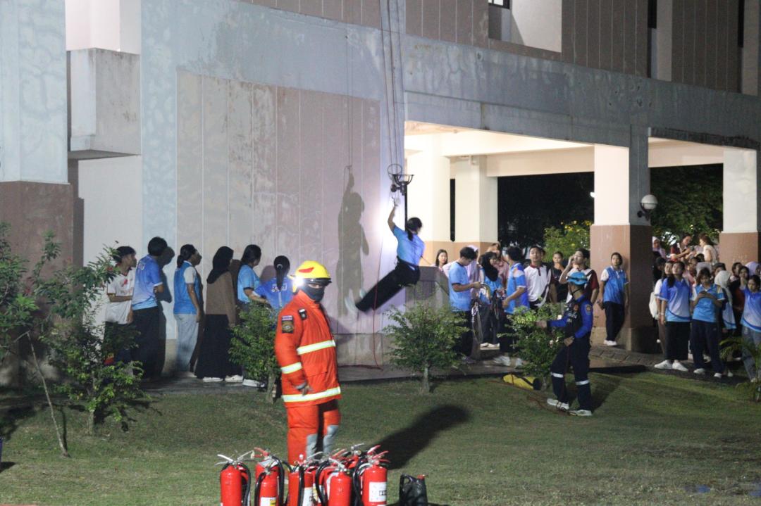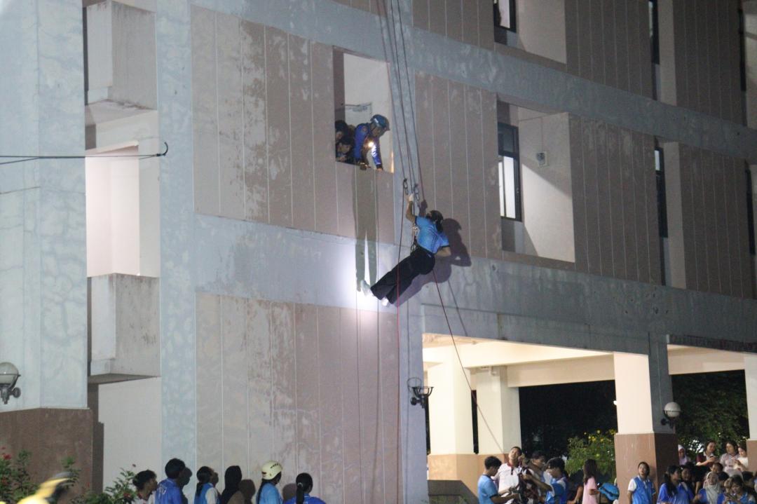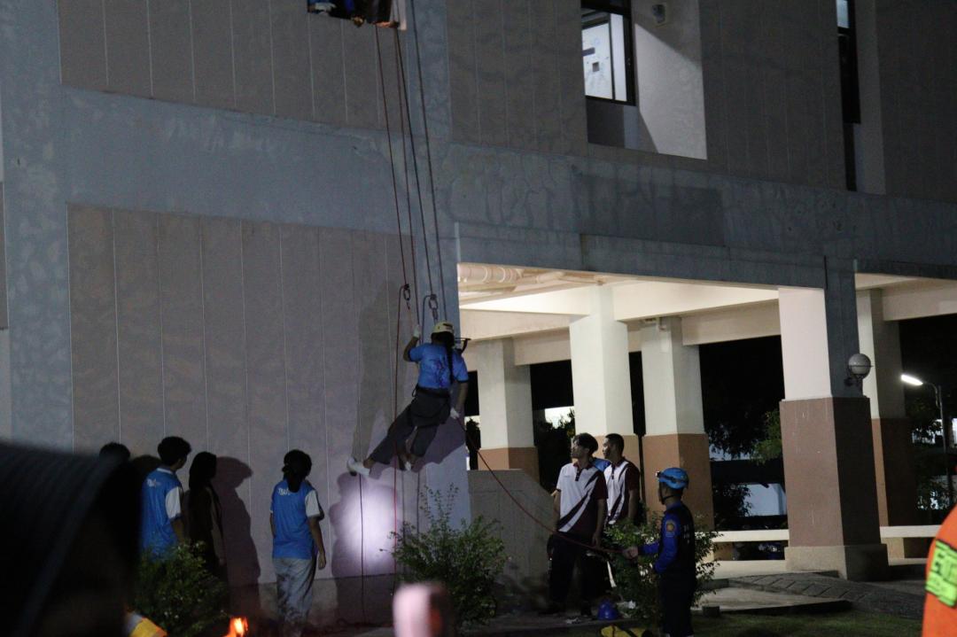 การอพยพจากอาคารสูง และการโรยตัวจากที่สูง ณ หอพักพะยอม 3 (หอพักนิสิตหญิง) โดยได้รับความร่วมมือจากทีมวิทยากรและเทศบาลตำบลบ้านพร้าว