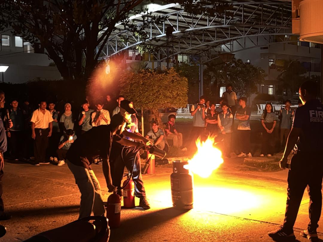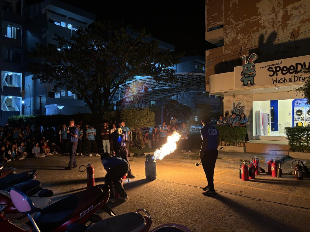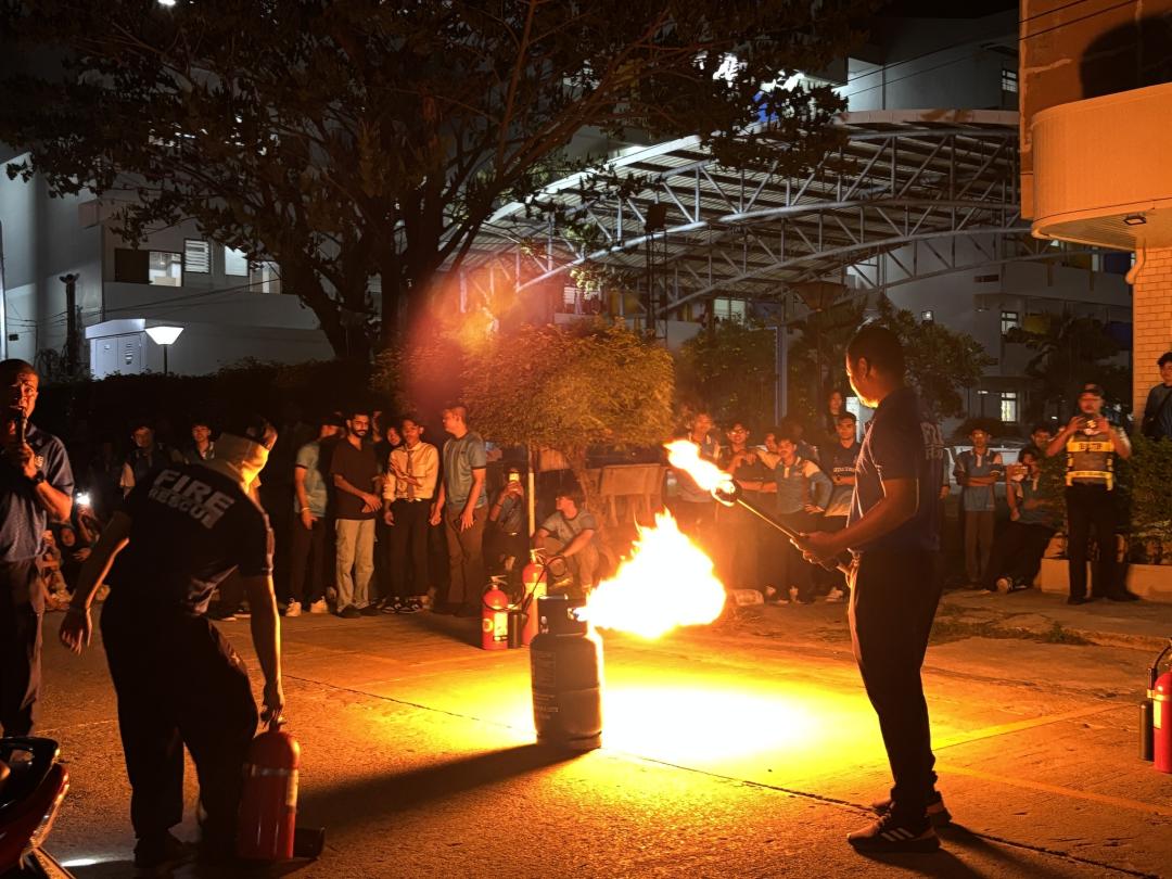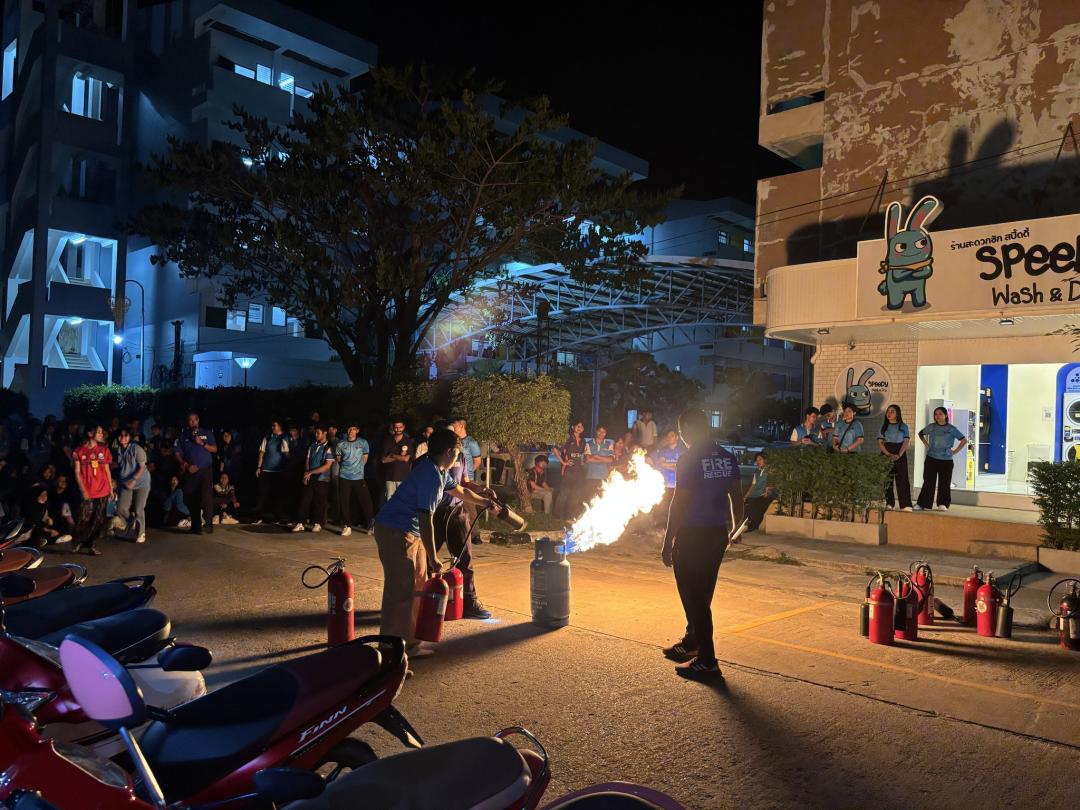 ฝึกซ้อมการดับเพลิง ณ บริเวณที่จอดรถข้างหอพักปาริชาต 1