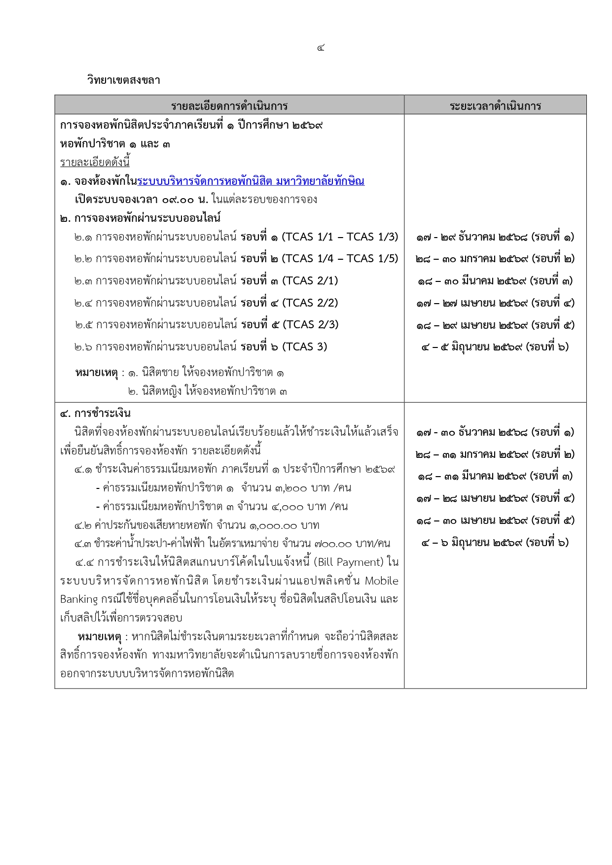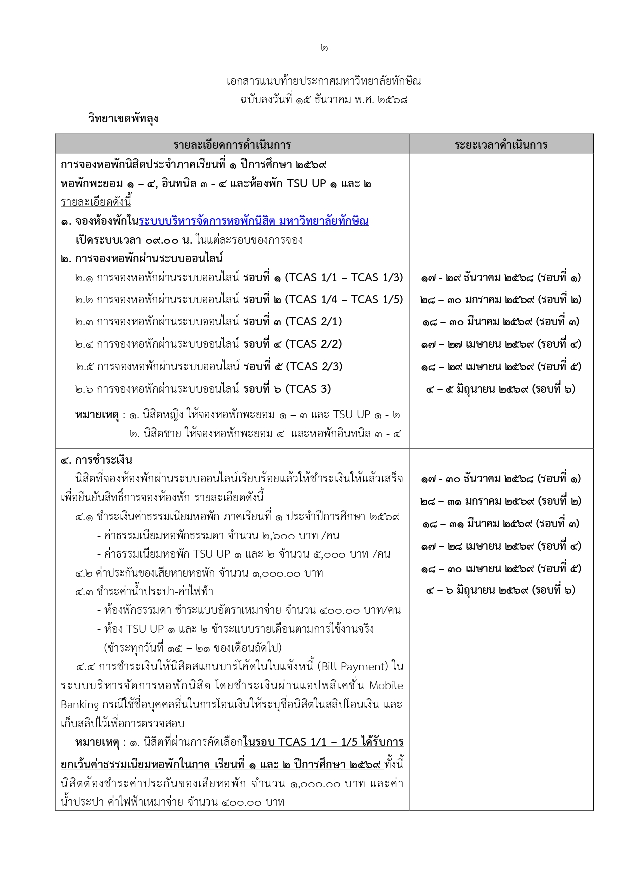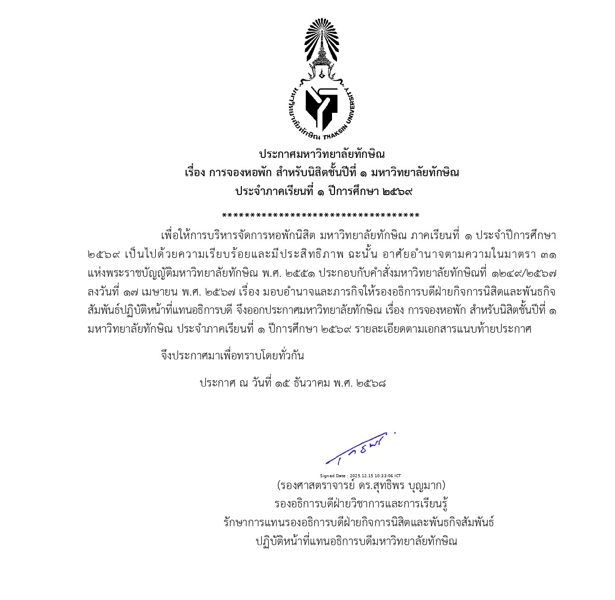 การจองหอพัก สำหรับนิสิตชั้นปีที่ 1 มหาวิทยาลัยทักษิณ ประจำภาคเรียนที่ 1 ปีการศึกษา 2569