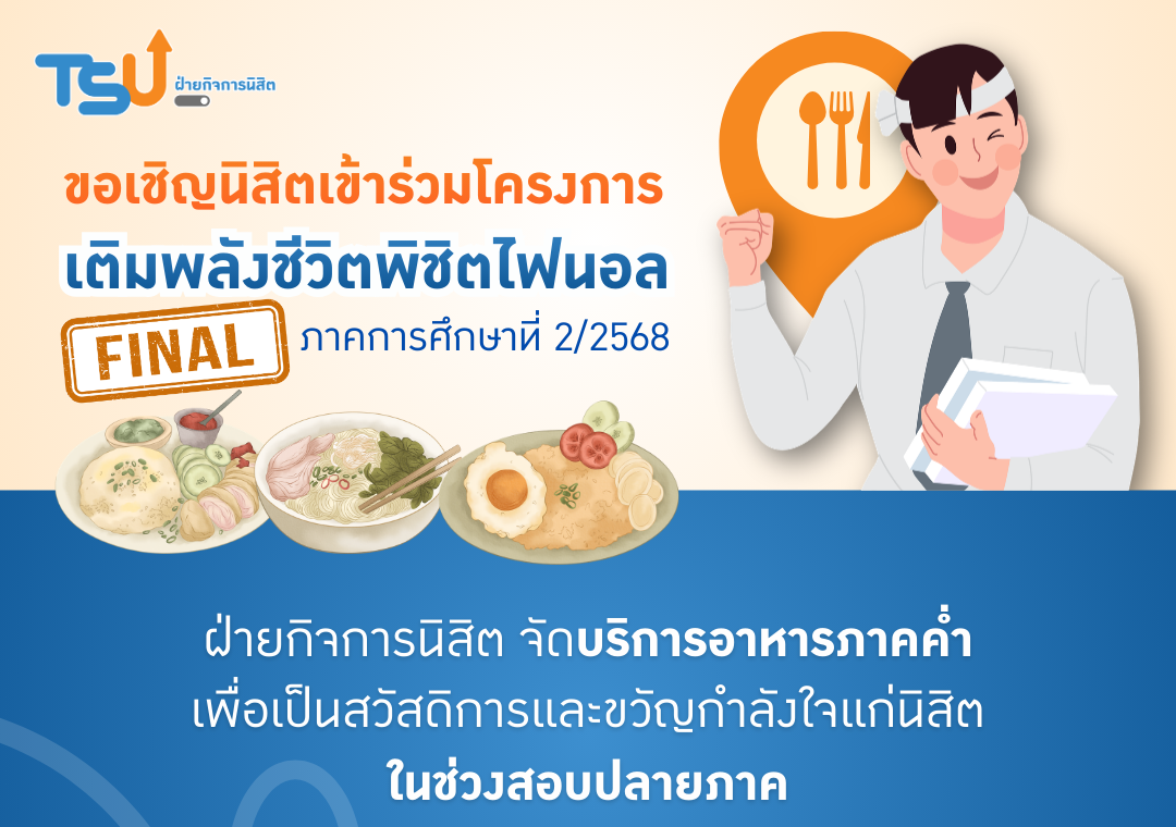 ขอเชิญนิสิตเข้าร่วมโครงการเติมพลังชีวิตพิชิตไฟนอล ภาคการศึกษาที่ 2/2568